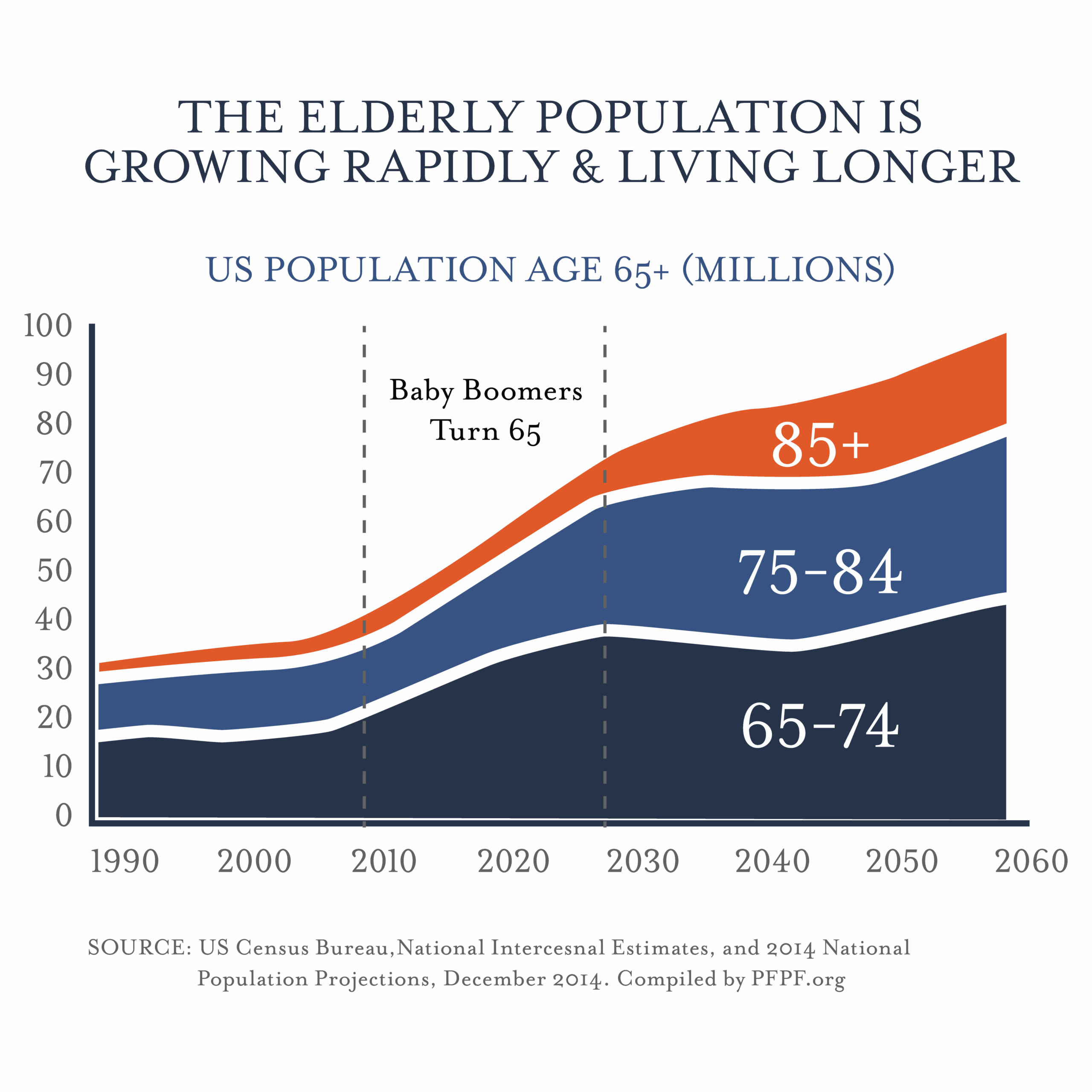 - The first wave of Baby Boomers is hitting 80 this year, and the “oldest old” cohort is projected to grow from roughly 4 million in 2000 to 21 million by 2050.